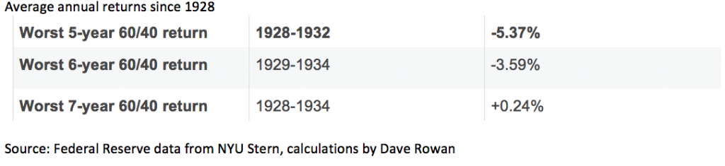 Worst 5-, 6- and 7-year performances of a 60/40 split