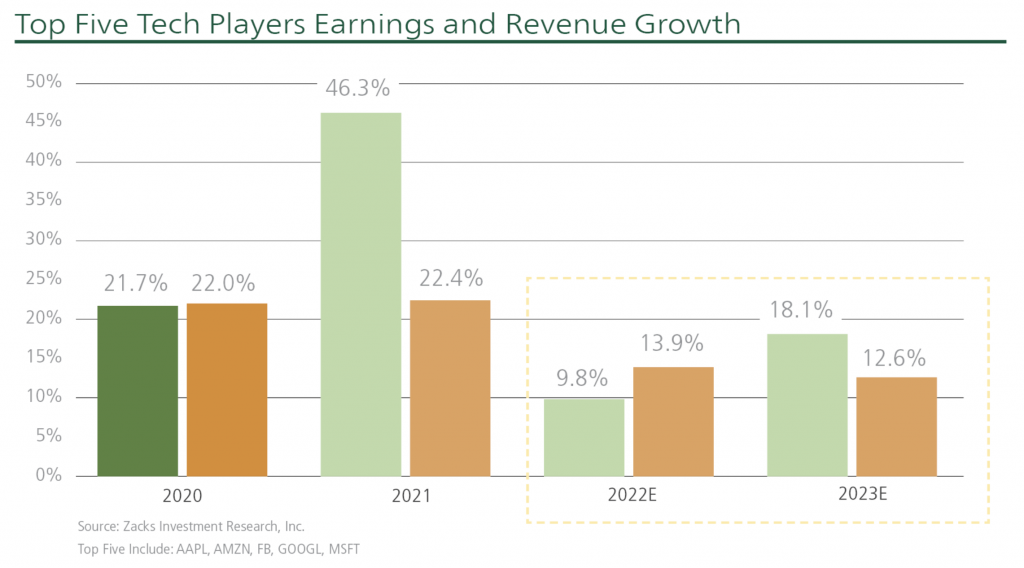 The notion of ‘peak’ earnings and growth has more to do with comparisons than it does actual long-term growth. Because the recovery from the pandemic was so swift, and because many of these technology companies are already massive, it makes sense that the rate of earnings and revenue growth would normalize at some point. Massive fiscal and monetary stimulus, coupled with a surge of demand from economic reopening, are isolated events – not recurring themes.